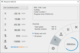 集成于設(shè)備單元前端的控制版面幾乎可以控制所有操作,用戶無需往返于電腦與設(shè)備之間。VPanel界面可與MDX-50無縫對接,方便用戶調(diào)整主軸轉(zhuǎn)速和速率。